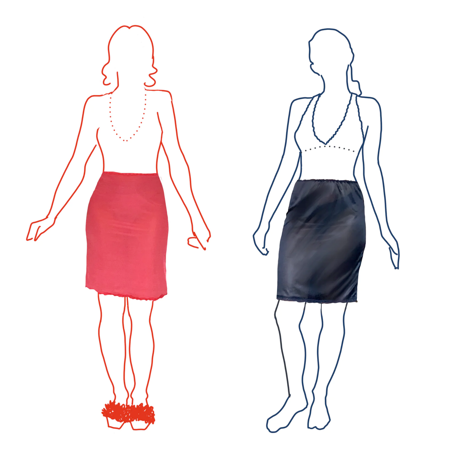 Hugs the waist and skims the hips. This slip is intended as a slinky under layer to wear under any dress or skirt.