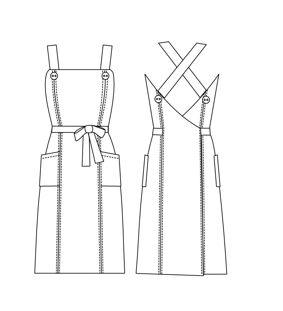 Hidden, gentle bust-shaping banishes the risk of a floppy neckline and gaping underarm. The dress is semi-fitted through the waist, and skims over the hips with a generous overlap at the back to give room for movement without risk of indecency. The panels make it easy to adjust the fit to suit your personal body shape and desired style. The fit can also be adjusted through the waist according to how you tie it up – double round for a cinch or tie at the side for sophistication (and room for dinner!) The pattern is drafted to sit at knee length with lengthen and shorten lines included on the pattern.
