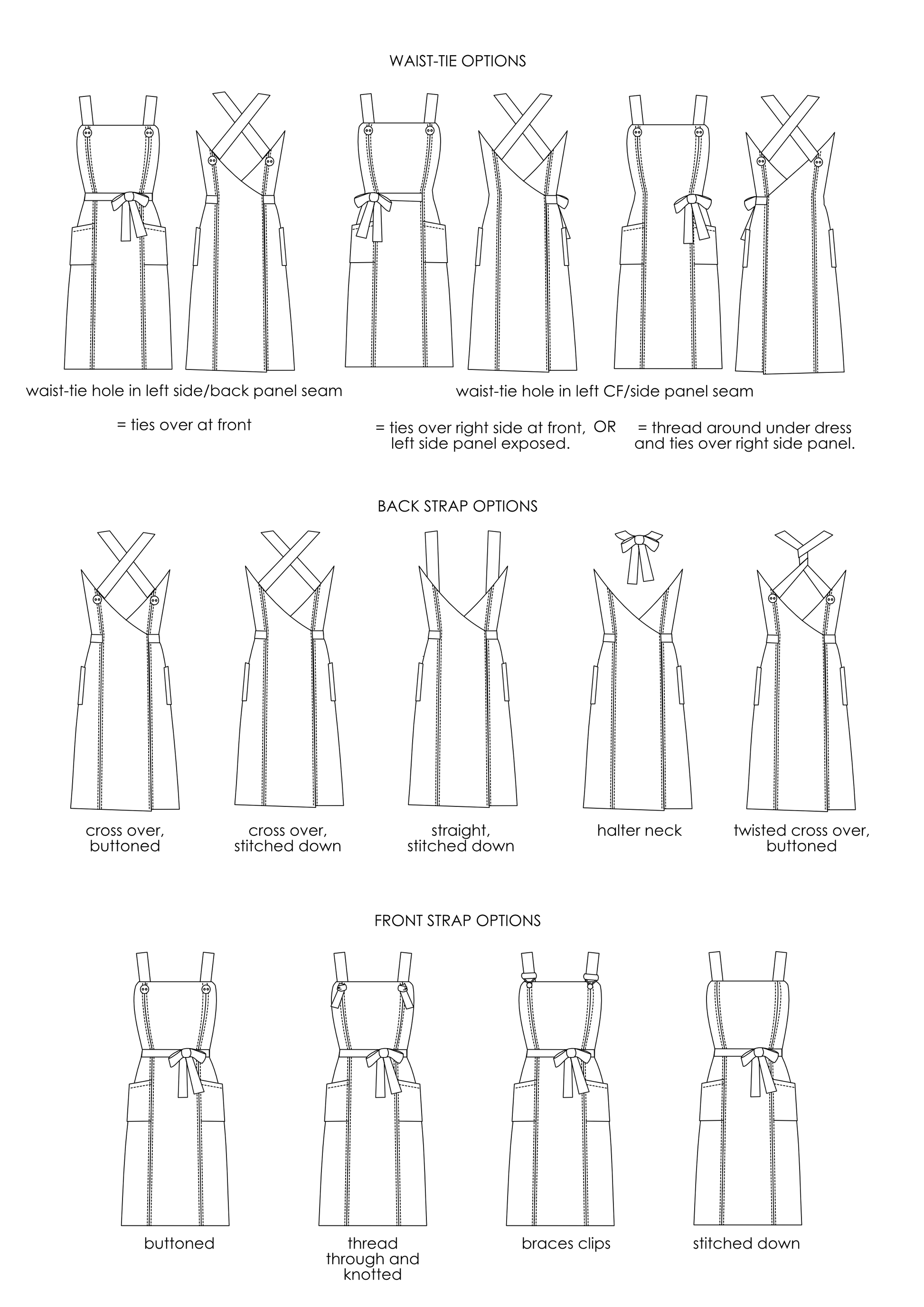 The straps can be attached and tied in multiple ways – straight, crossed, twisted, halter... For a zero-haberdashery option omit the buttons and just use fabric straps; alternatively make a feature of some braces clips or fancy buttons. Or for the lazy option just raid your collection of brooches, badges and pins! There are also lots of ways to tie the dress around the waist for different looks.