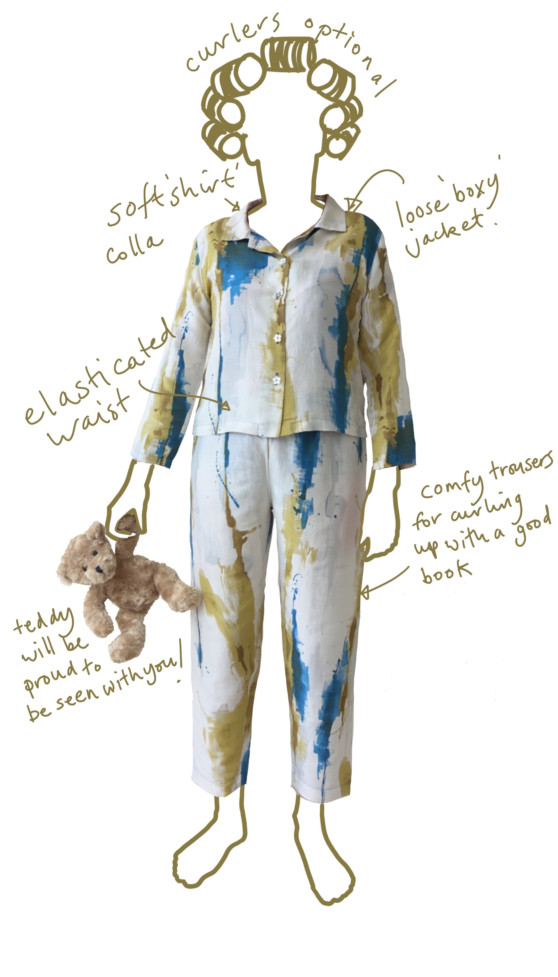 Room to curl up but sleek enough to wear to a pyjama party. The sleeve and leg lengths are designed to be slightly cropped, sitting just on the wrist, and above the ankle, but both are easy to lengthen.
